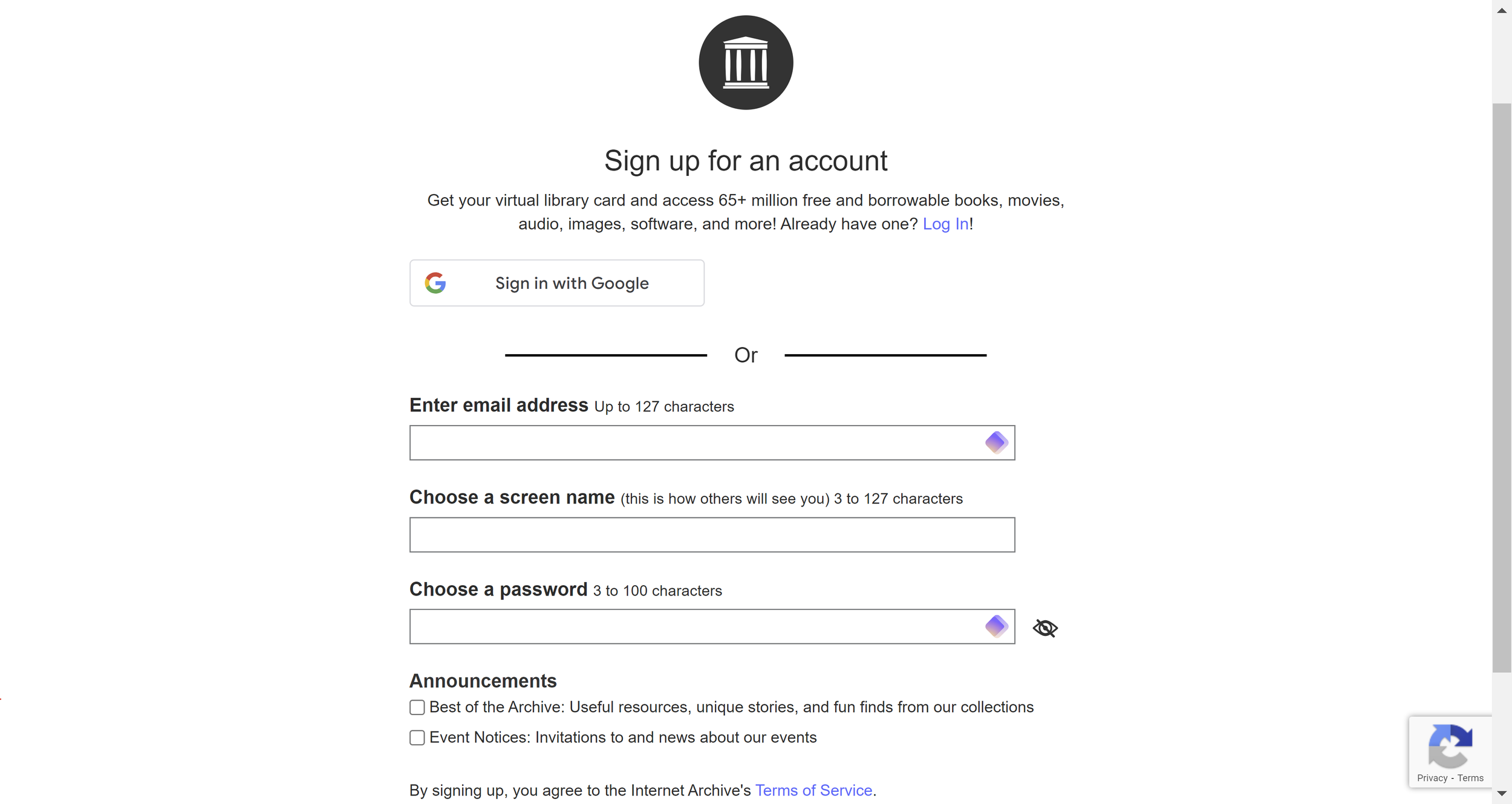 You can certainly start manually entering passwords from wherever you keep them, but here’s a neat time saver. You can also have these records added as you need them. I’m going to use the Internet Archive website as an example, and lets assume we don’t have a logon there yet. By the way, this is a fun service that has millions of royalty free movies, audio, images, books and more. So let’s set up a login for the first time to this service. You can try this along with me or use some other site you don’t have a login for. The signup page is shown to the left. But notice that it already has purple diamonds next to some fields. But we don’t have a record for it yet. The email for example, we certainly can enter our email address from memory, but lets let the password manager do it.