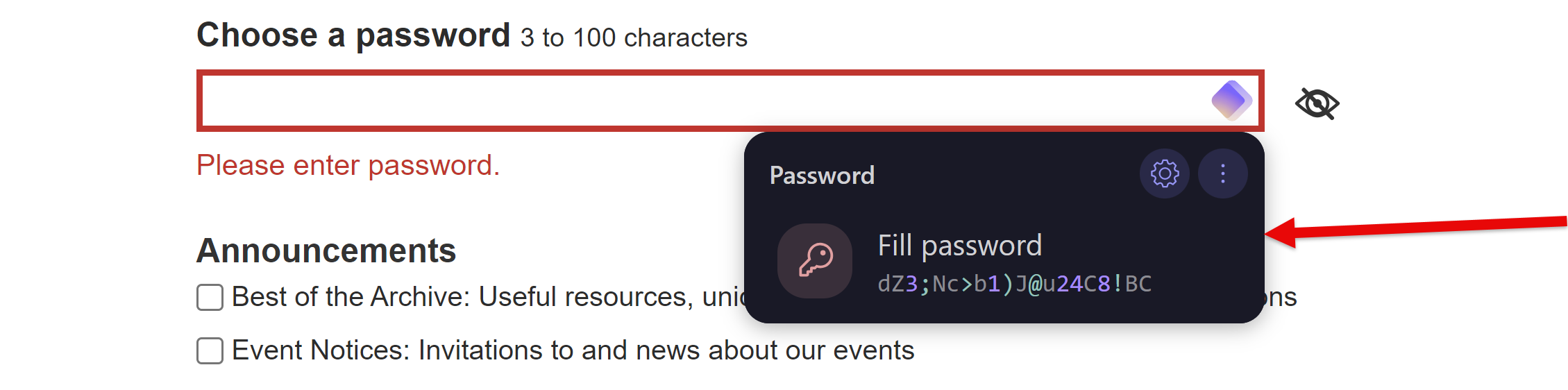 Look at the password it suggested! We’ll never remember that. That’s the beauty of a password manager. We don’t need to, and we’ll never have to type it in. So let’s just click on it and let it fill it in for us!